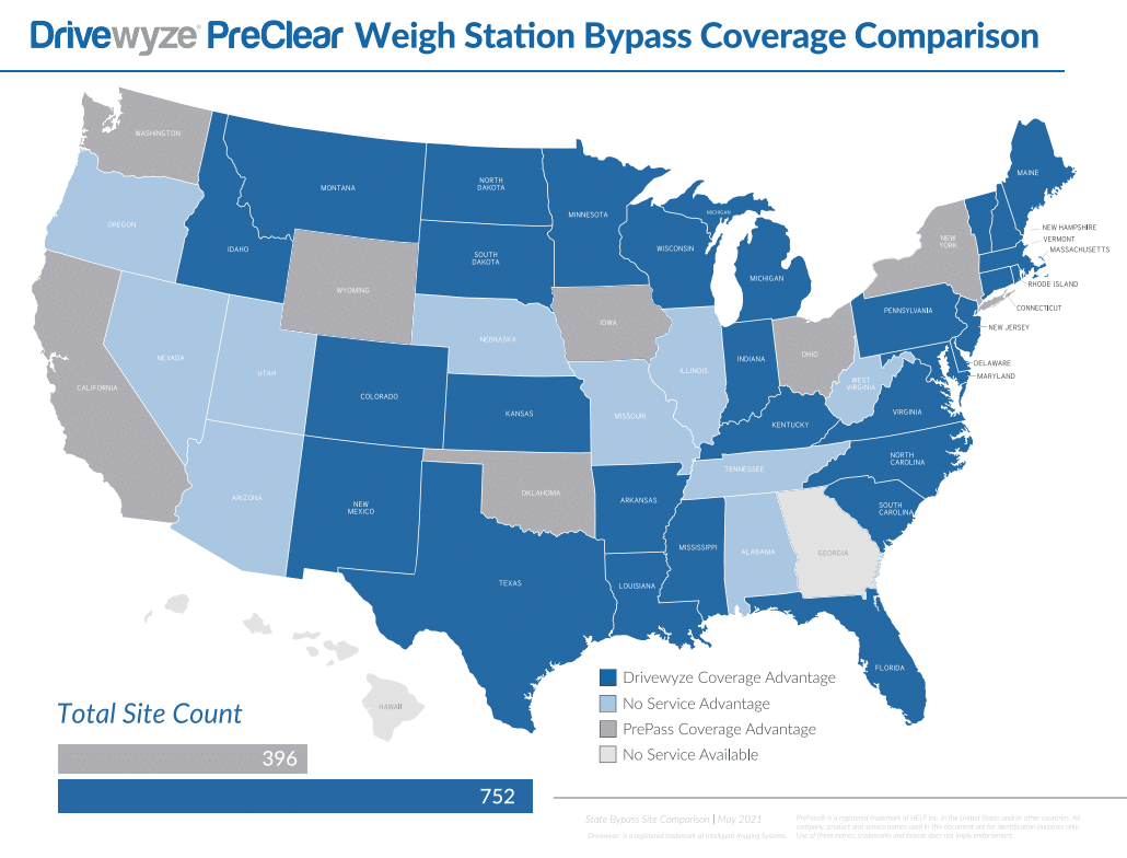 Drivewyze through Fleetistics can help reduce the overall costs with legal bypasses by using the largest network in North America, PreClear, which offers almost 3x the bypass opportunities as any other provider.